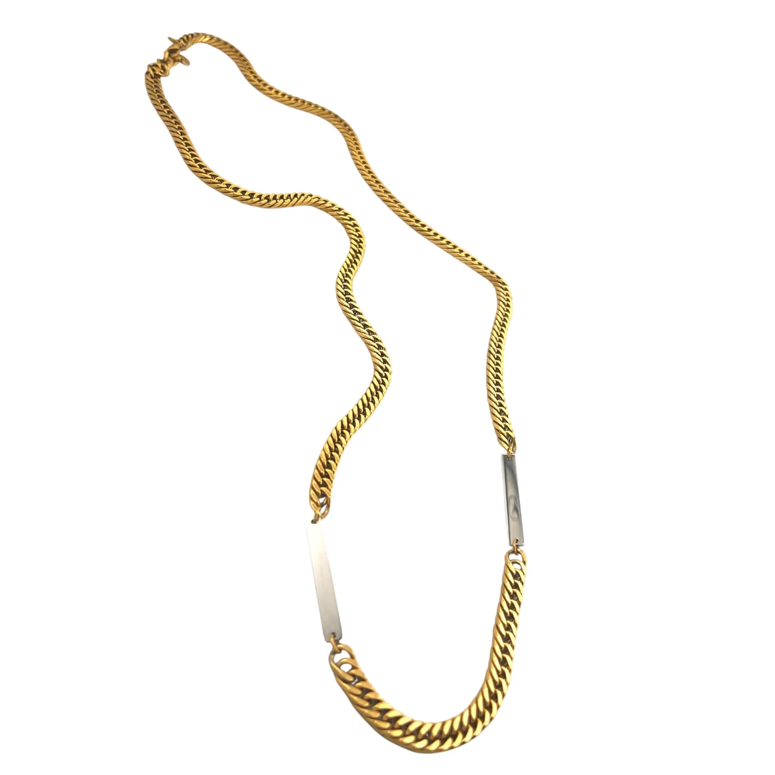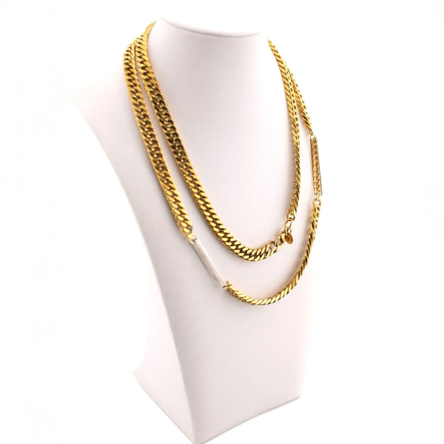 Gold plated ion 34 inches long with stainless steel bar. this also can double as a belt as seen on the model