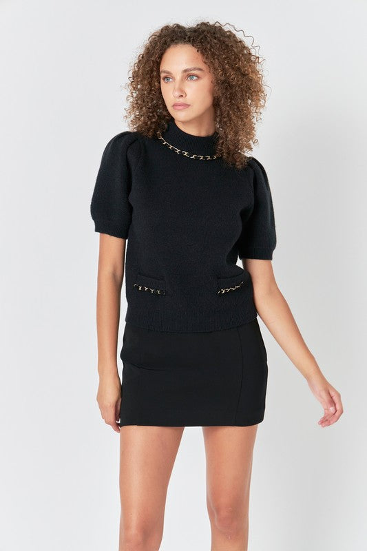 Meet your new wardrobe icon — The Fifth Avenue Sweater blends classic elegance with a touch of edge. Featuring puff sleeves and gold chain detailing at the neckline and pockets, this knit adds instant polish to any outfit. Style it with a mini skirt or tailored trousers for that effortlessly chic, uptown look.