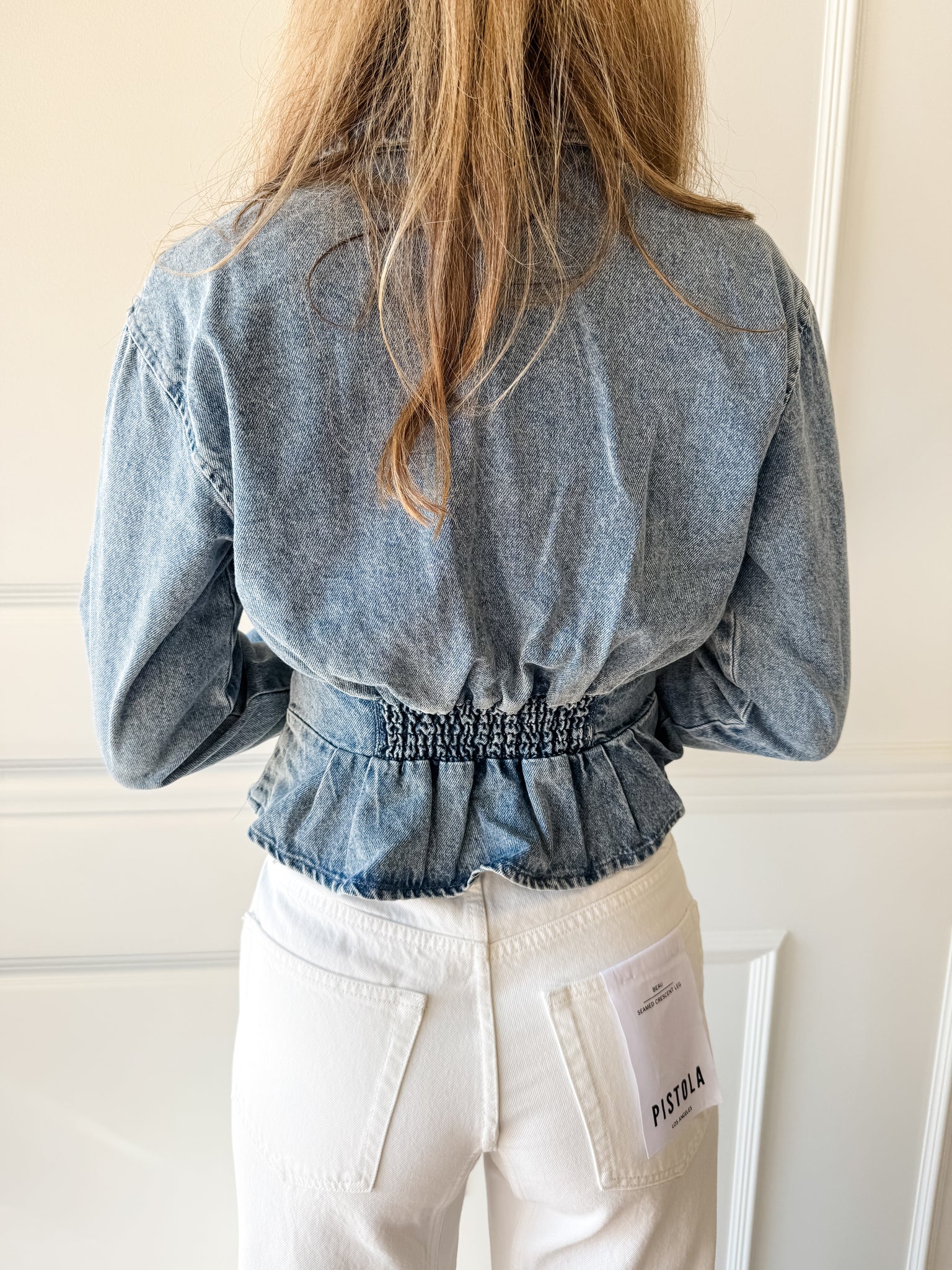 A feminine twist on a denim classic, this zip-front peplum jacket cinches at the waist for a flattering, layered look.
