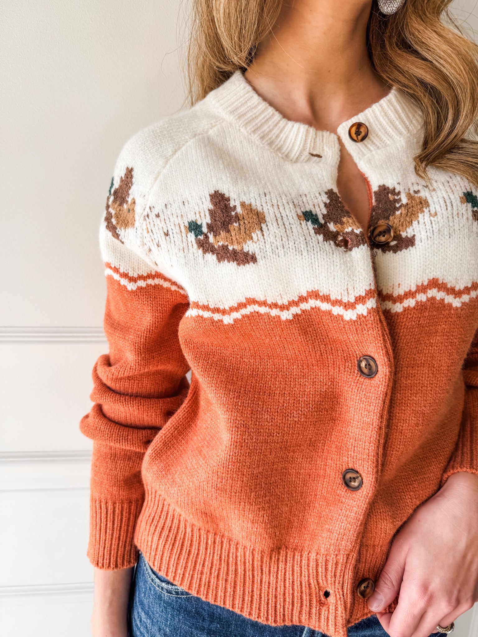 Wrap yourself in cozy charm with our Autumn Flight Cardigan. Featuring a warm, pumpkin-spice knit body and a soft ivory yoke adorned with a subtle flying-bird pattern, this button-front cardigan brings all the nostalgic fall feels. The relaxed fit and ribbed cuffs make it easy to wear open or closed — perfect for jeans, leggings, or layering over simple tees. A must for brisk mornings, coffee runs, and holiday gatherings.