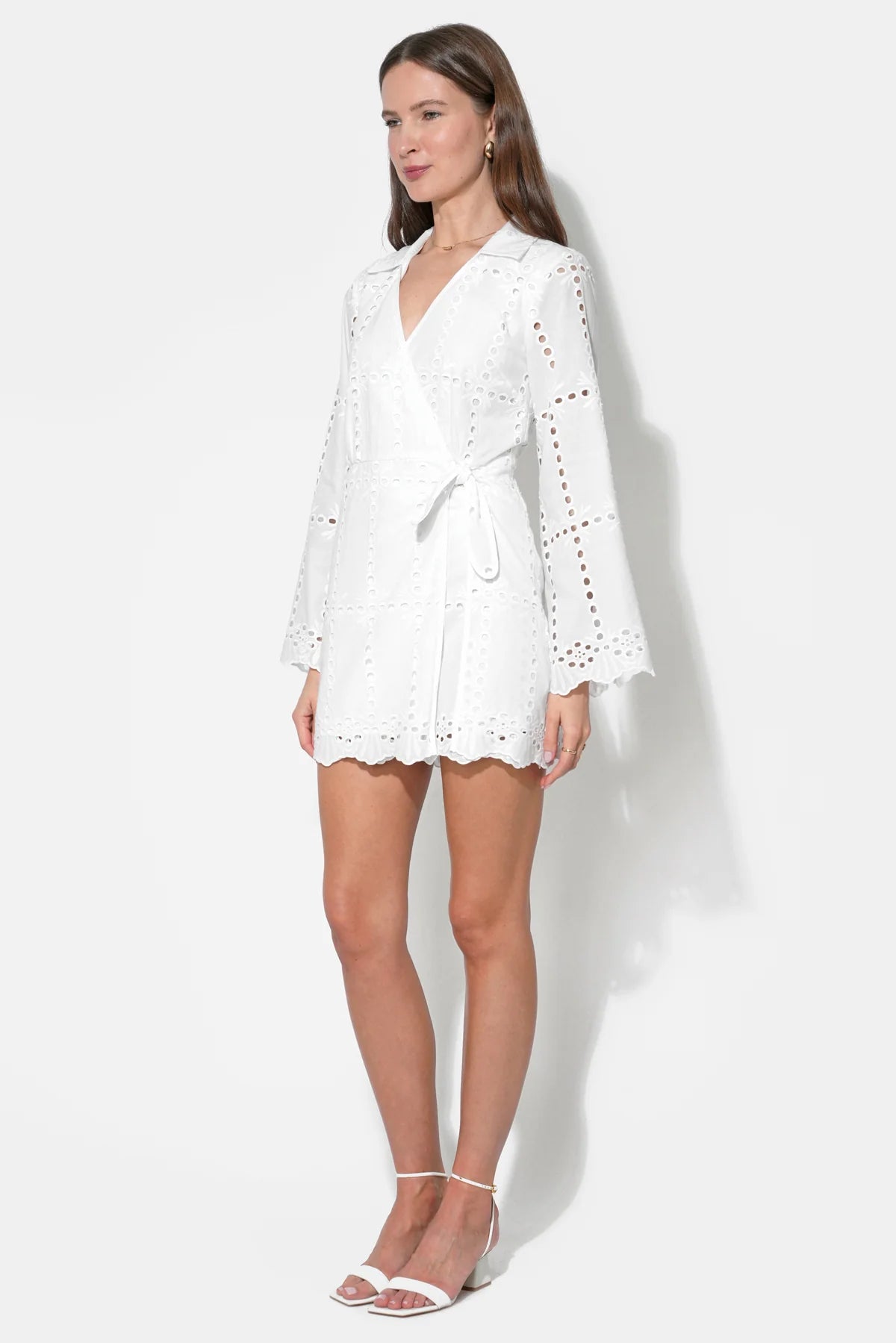 The garment features an all-over eyelet embroidery, characterized by delicate open-work patterns that provide both visual interest and cooling ventilation. Its defining feature is the true wrap design, which allows for a customizable fit at the waist, cinching the silhouette perfectly before falling into a playful mini-length hem.