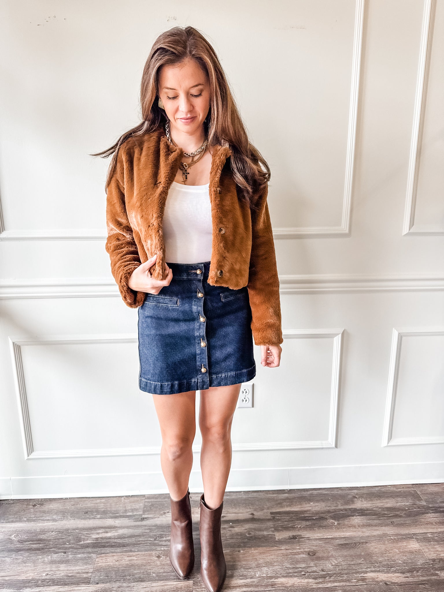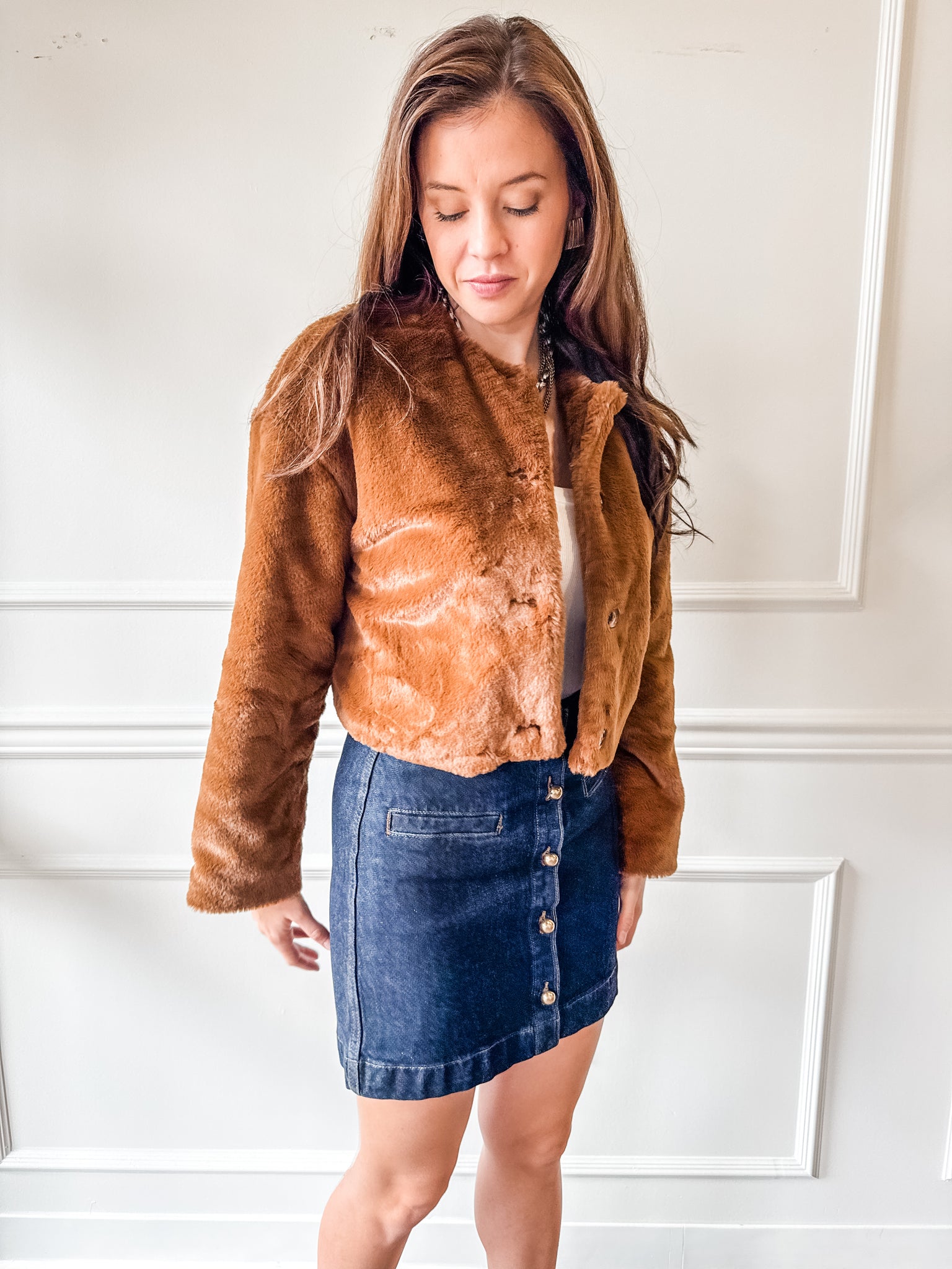 The Caramel Cloud Faux Fur Jacket is ultra-soft, slightly cropped, and feels like wrapping up in your favorite blanket—but make it chic. The warm caramel color pairs perfectly with denim, dresses, and everything in between.