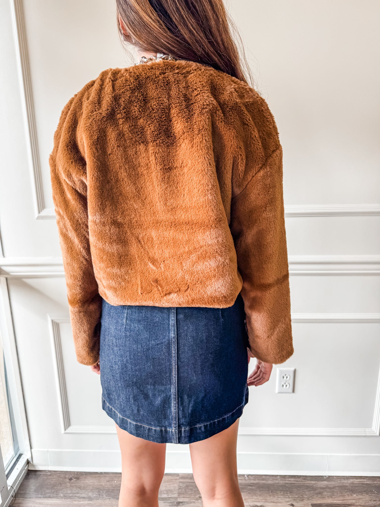 camel faux fur jacket, cropped fur coat, teddy jacket, brown fuzzy jacket, winter outerwear, cozy jacket
