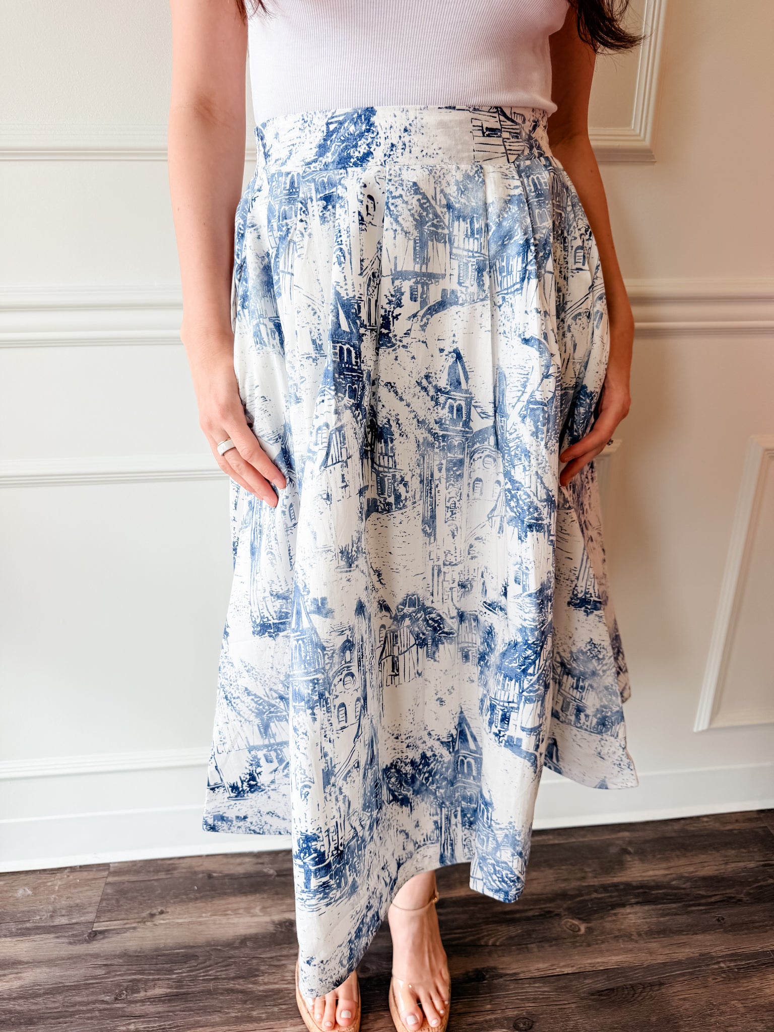 A statement piece with timeless appeal. This midi skirt features a beautiful toile print and a flattering, flowy silhouette. Style it with a simple top or pair it with the matching blouse for a coordinated look.