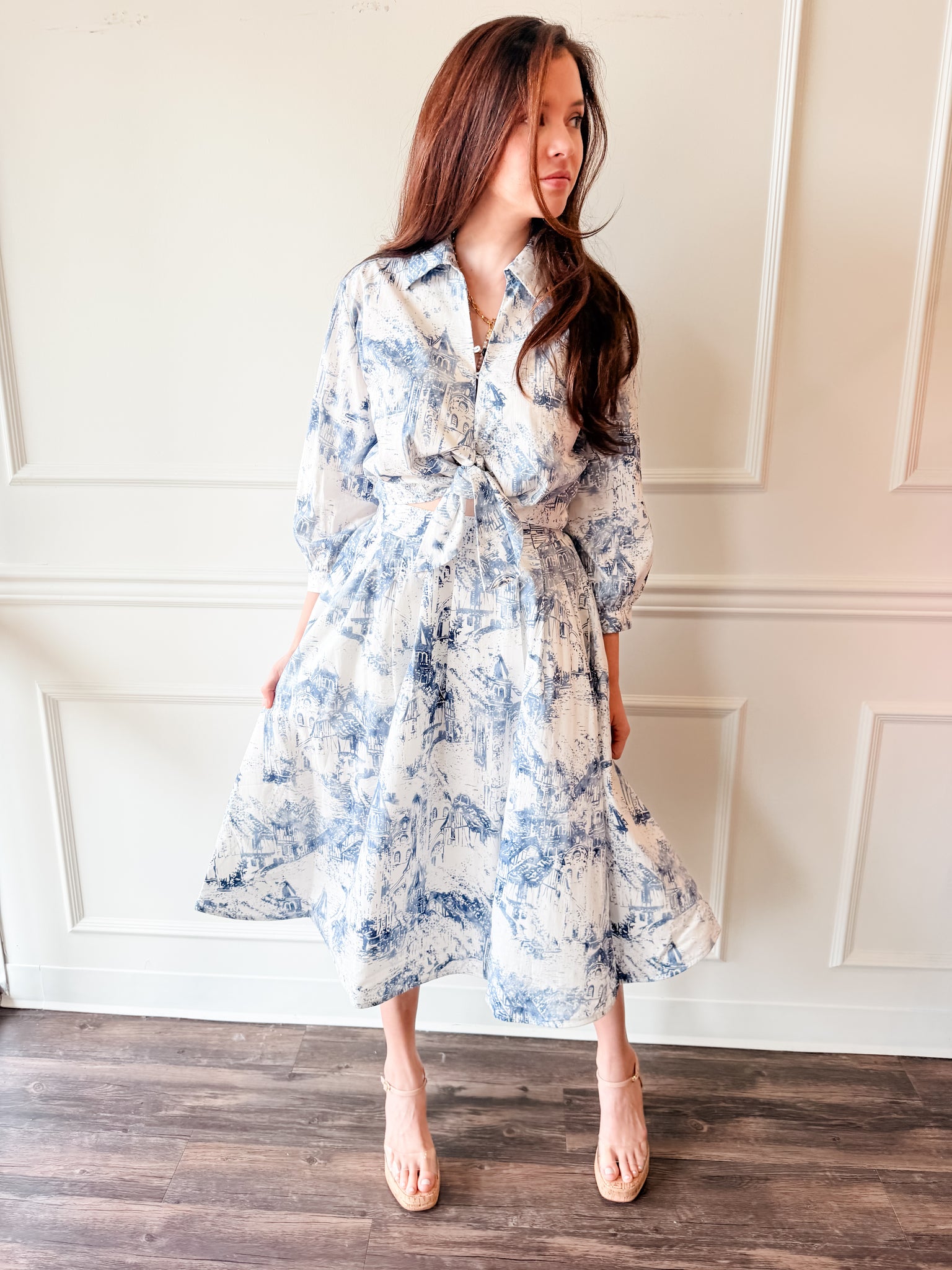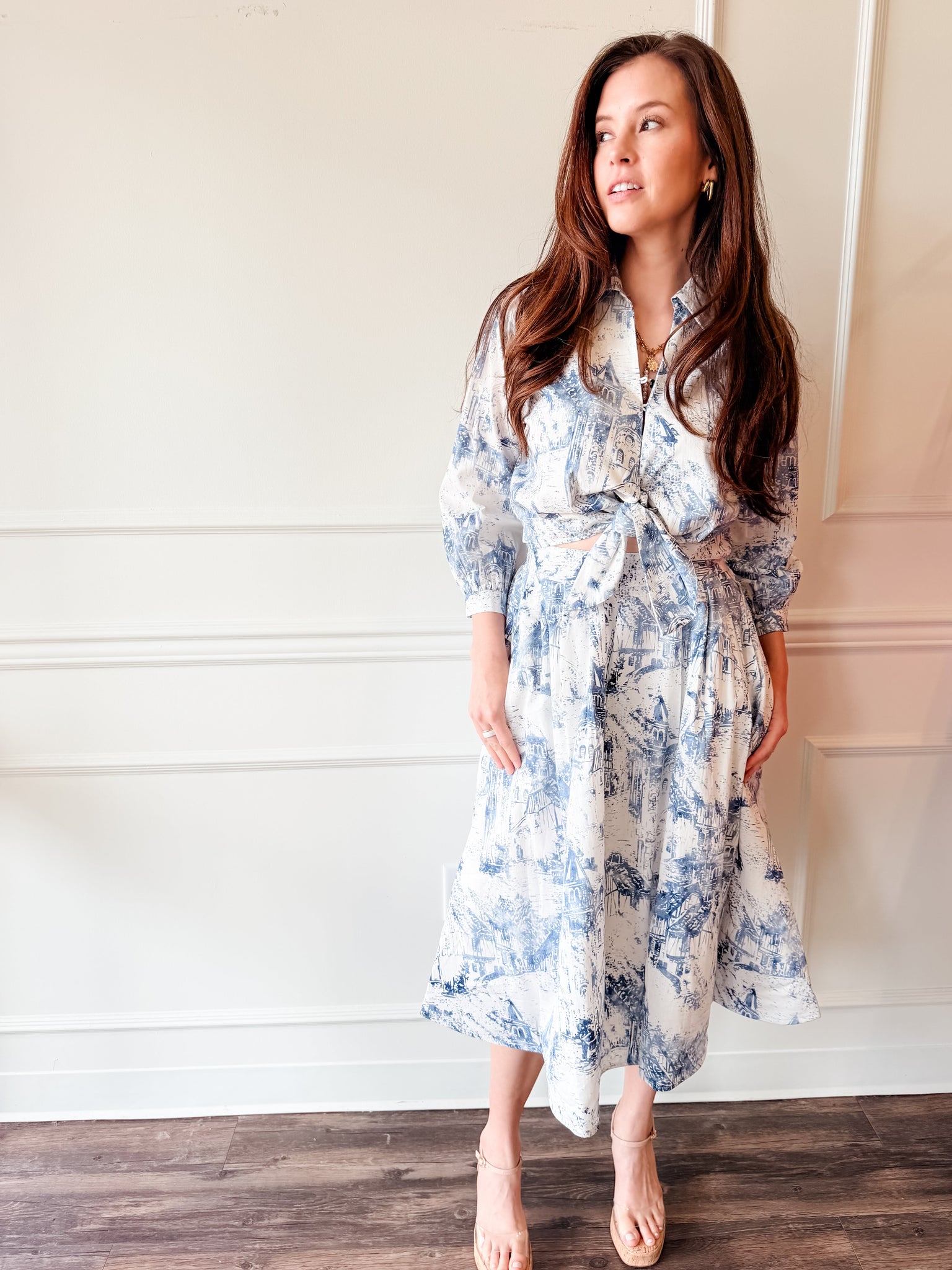 Chic with a touch of European charm. This lightweight blouse features a classic toile print and a flattering front tie detail that adds shape and style. Perfect for dressing up denim or pairing with crisp white bottoms for an elevated everyday look.
