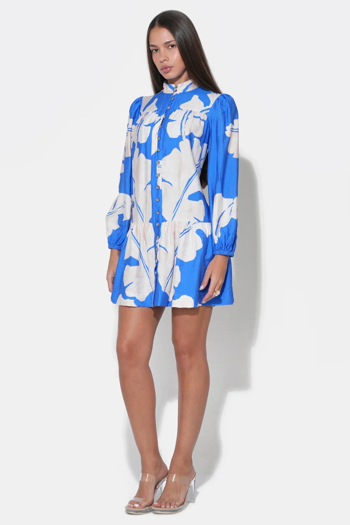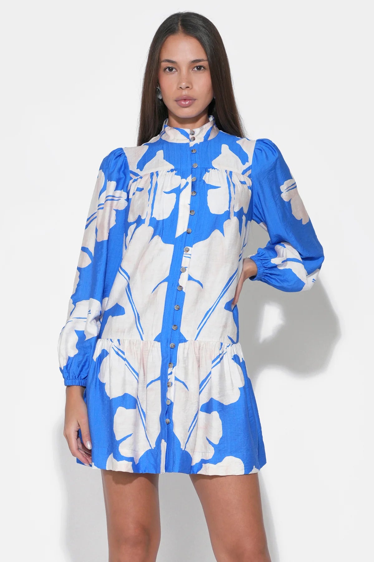 Rendered in a striking Royal Blue and Ivory colorway, the Ella dress relies on bold color-blocking or a refined pattern (often a classic floral or geometric print) to create visual impact. The design features a sleek mini-length silhouette that is perfectly balanced by the modesty of full-length sleeves, making it an ideal choice for transitional weather.