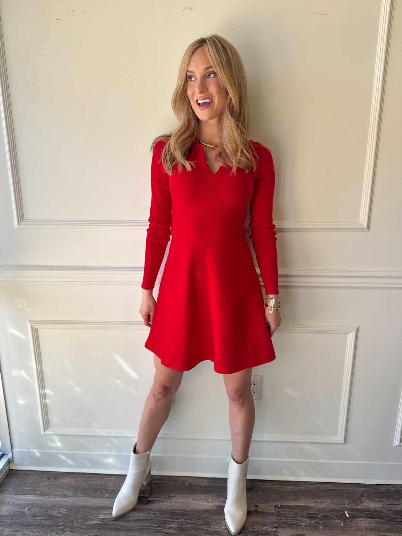 Make spirits bright in The Holly Dress! This rich red knit dress features a flattering collar, ribbed texture, and a slightly flared fit that’s made for holiday dinners, date nights, and seasonal soirées.
