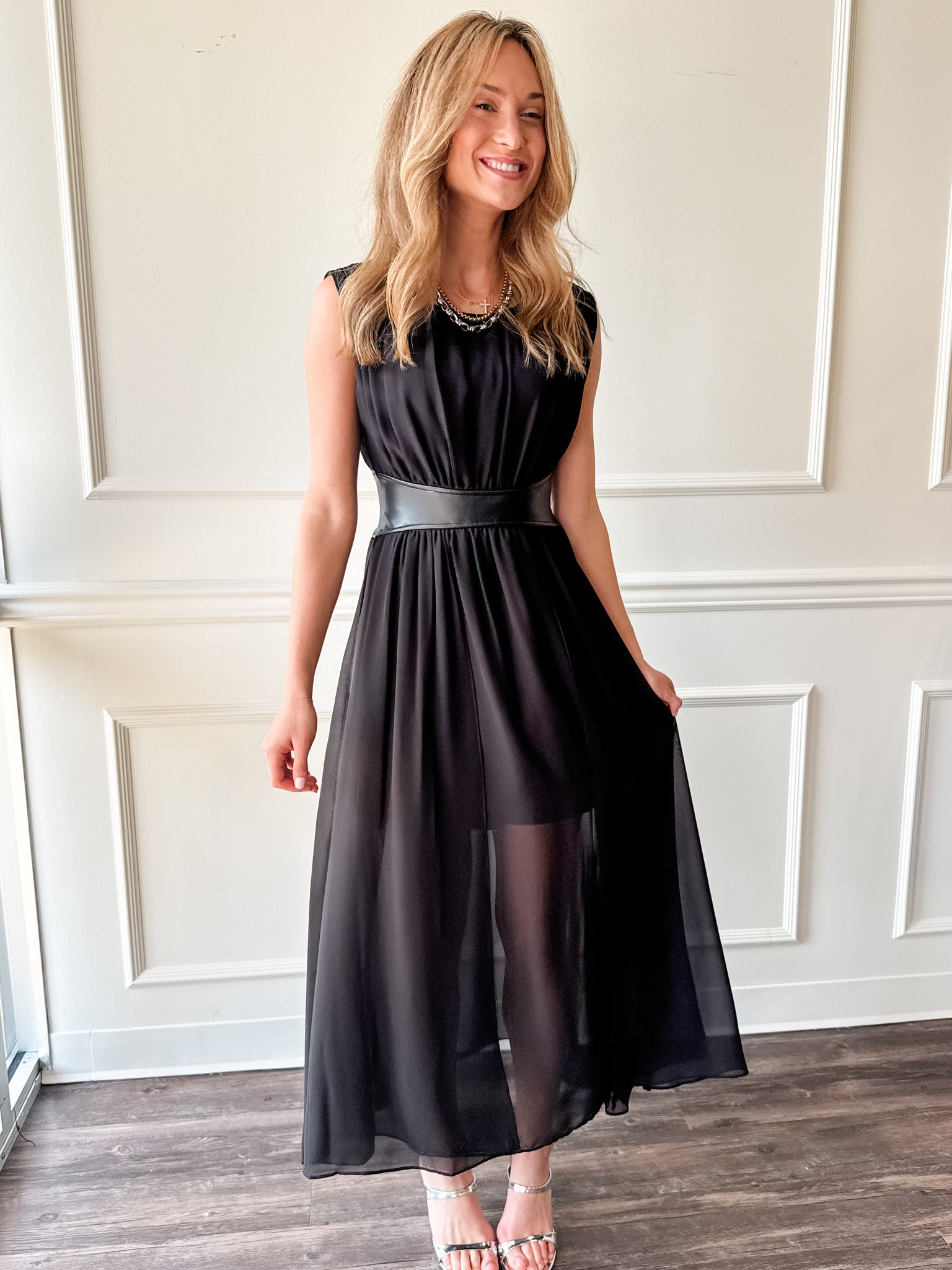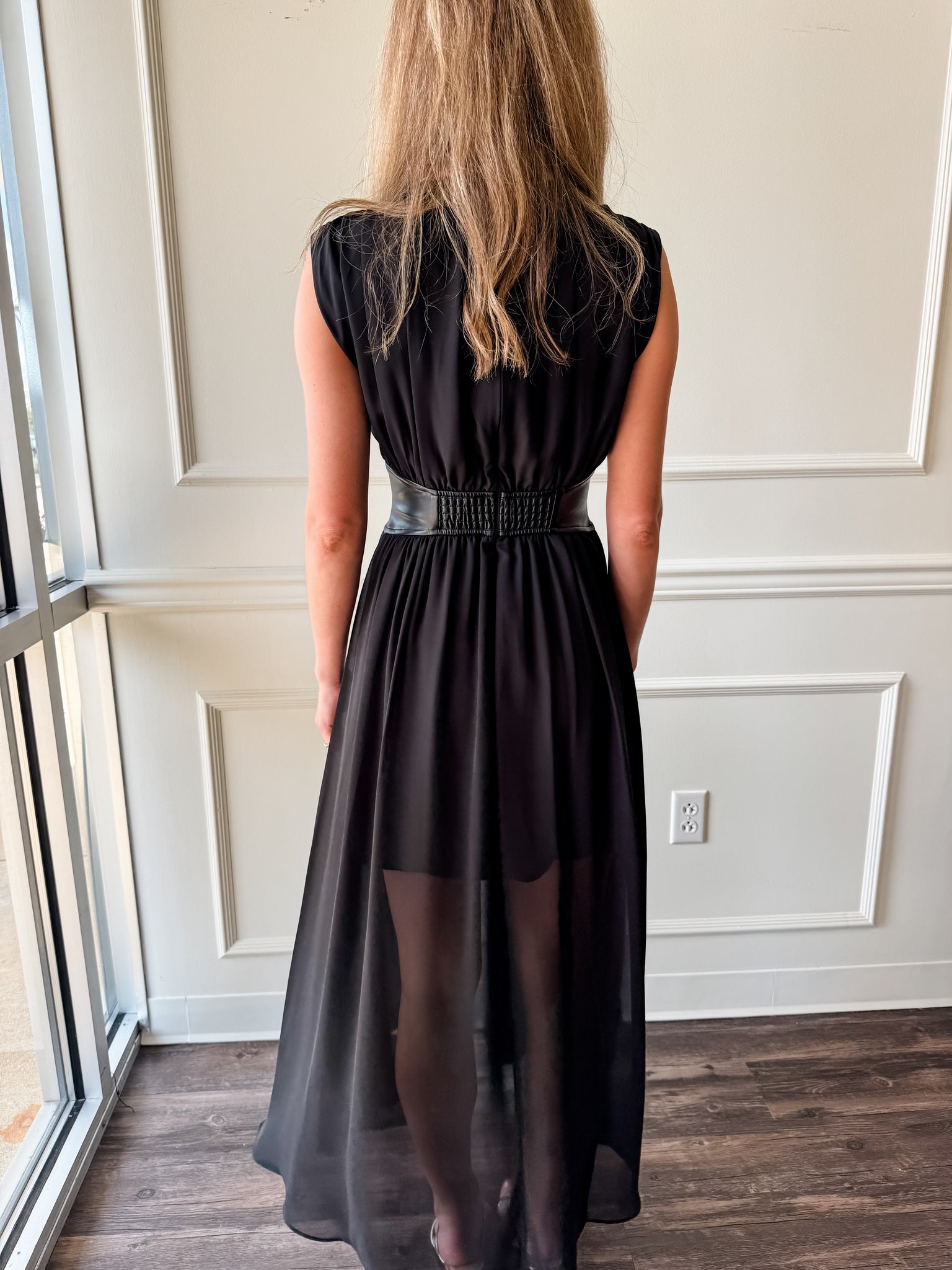 A band of faux leather cinches the waistline of an ankle-grazing maxi dress cut with a leg-baring slit for added allure.
