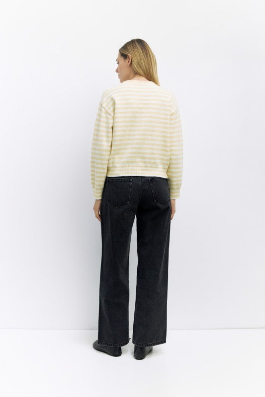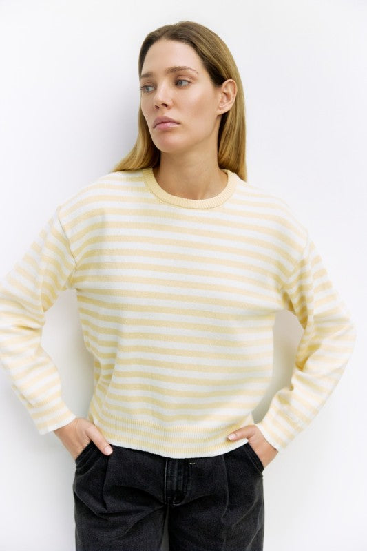 striped knit sweater, cream yellow sweater, lightweight knit, neutral sweater, spring layering top, casual boutique sweater