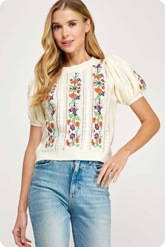 The Meadow Bloom Embroidered Knit is a dreamy knit that feels straight out of a European spring. Featuring delicate cable knit texture, puff sleeves, and vibrant embroidered florals, this sweater is cozy yet feminine. Pair it with denim or a skirt for an effortlessly chic boutique look.