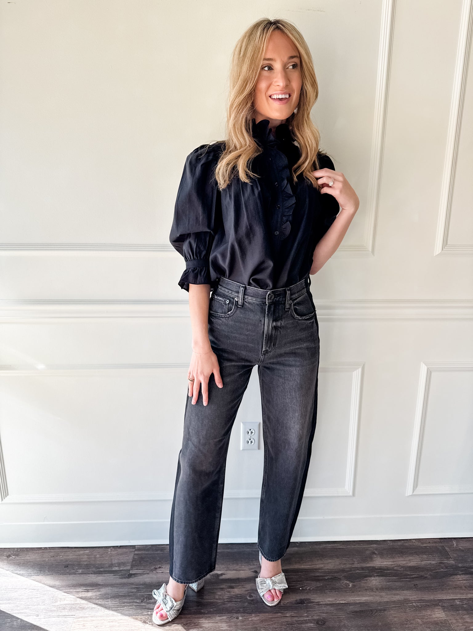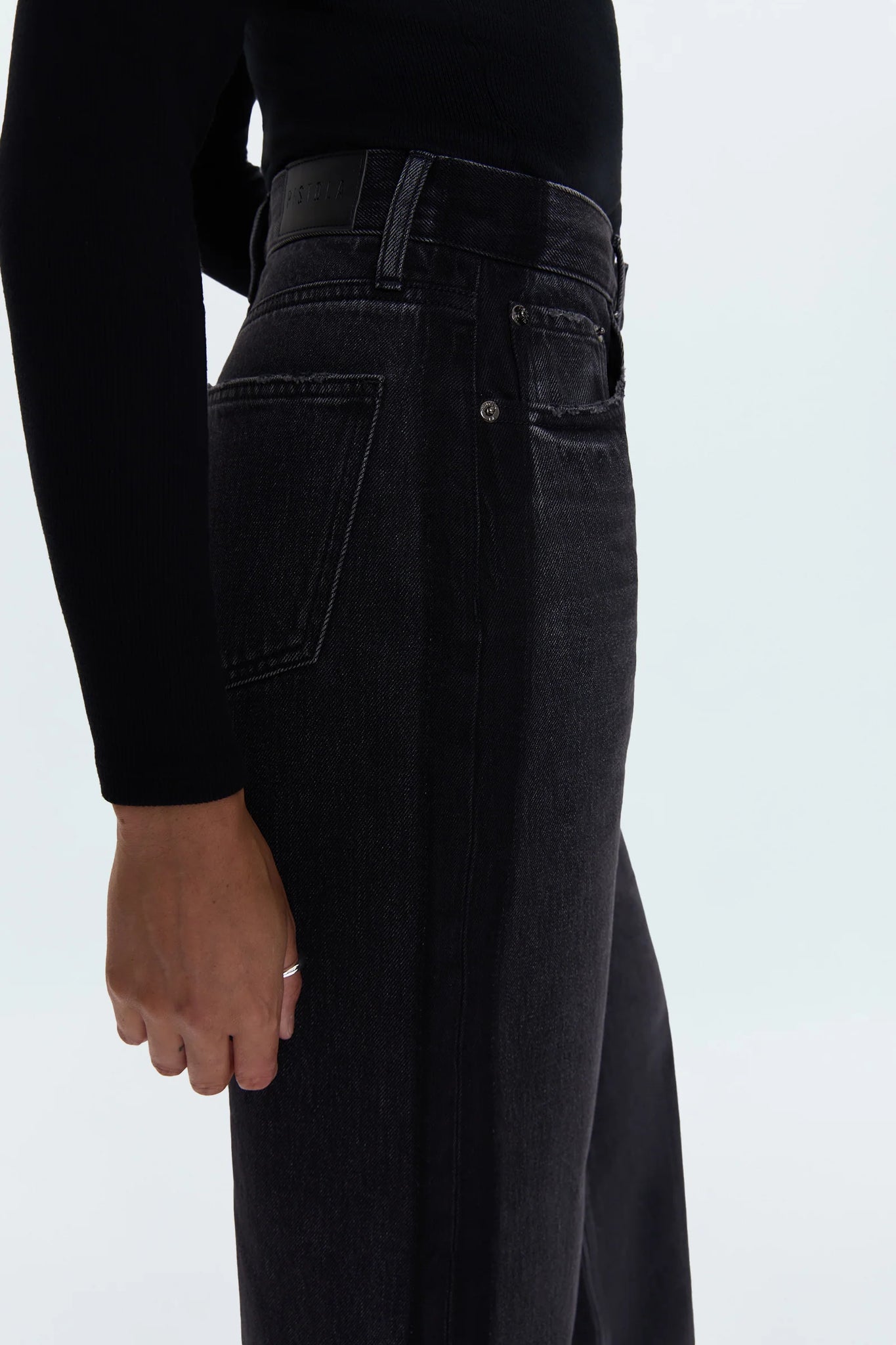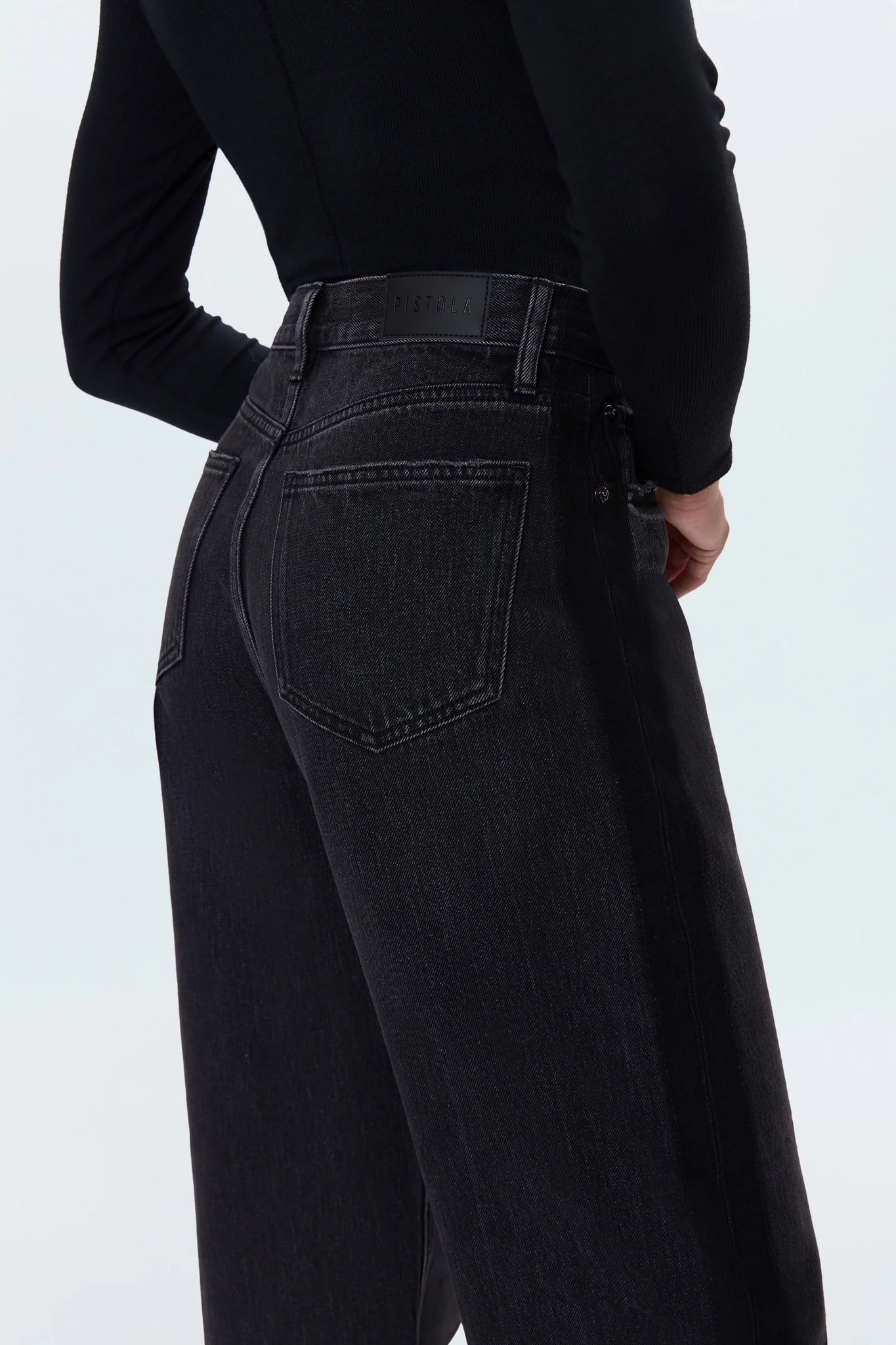 A best-selling silhouette, Wes offers a flattering high rise and full-length 30" inseam in a stylish barrel leg that delivers sophisticated drama. Clean hems and a tuxedo stripe detail refine the shape, while premium rigid non-stretch denim in Cinema, a rich black wash, adds effortless polish and versatility.
