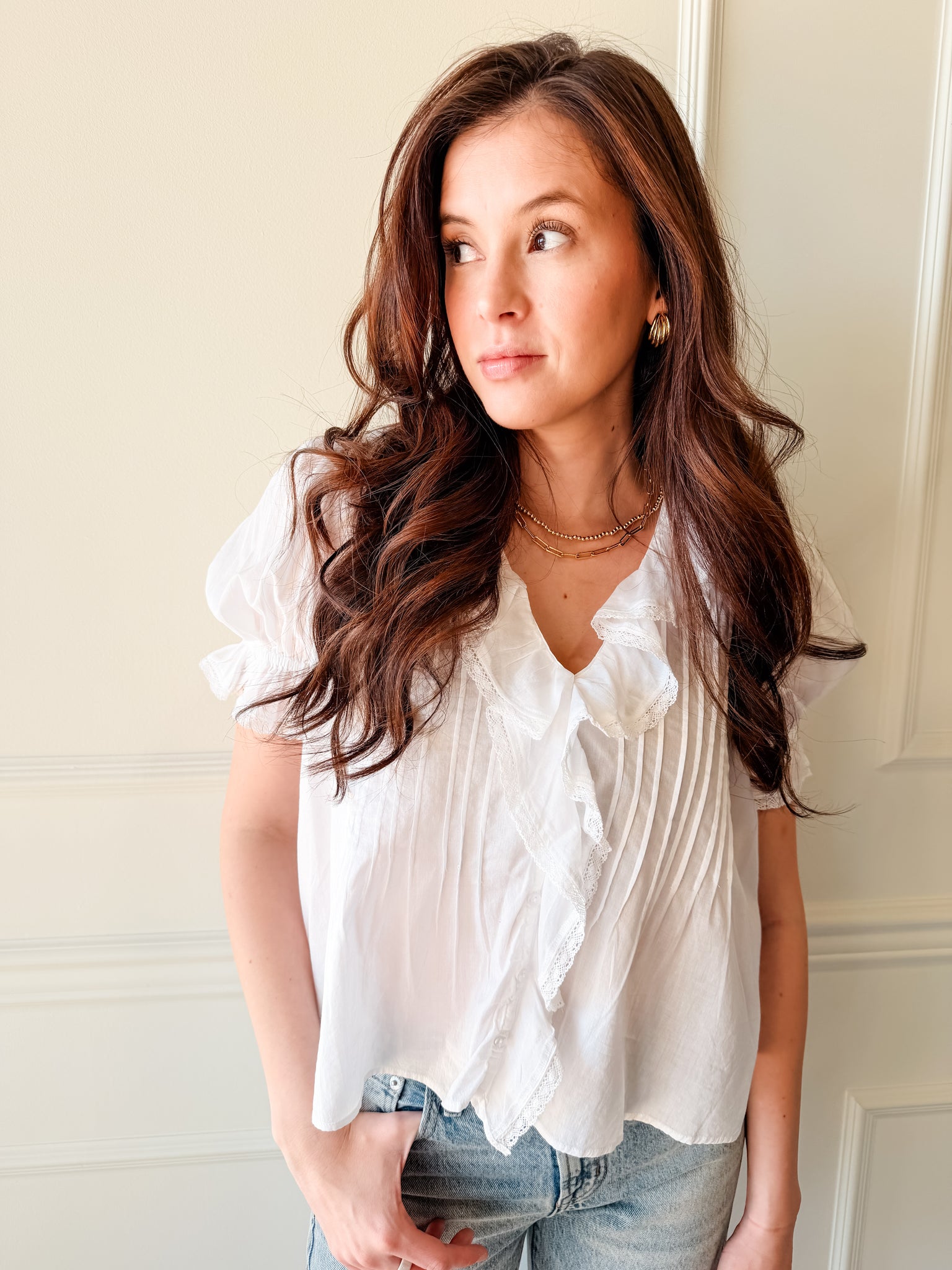 Romantic, feminine, and easy to wear — the Steve Madden Lyric Top is the perfect dress-up white blouse. Featuring soft ruffle detailing down the front and airy fabric, this top instantly elevates denim, skirts, or trousers. The flattering neckline and fluttery sleeves make it great for date night, brunch, or work-to-weekend outfits. One of those timeless white tops you’ll always be glad you grabbed.