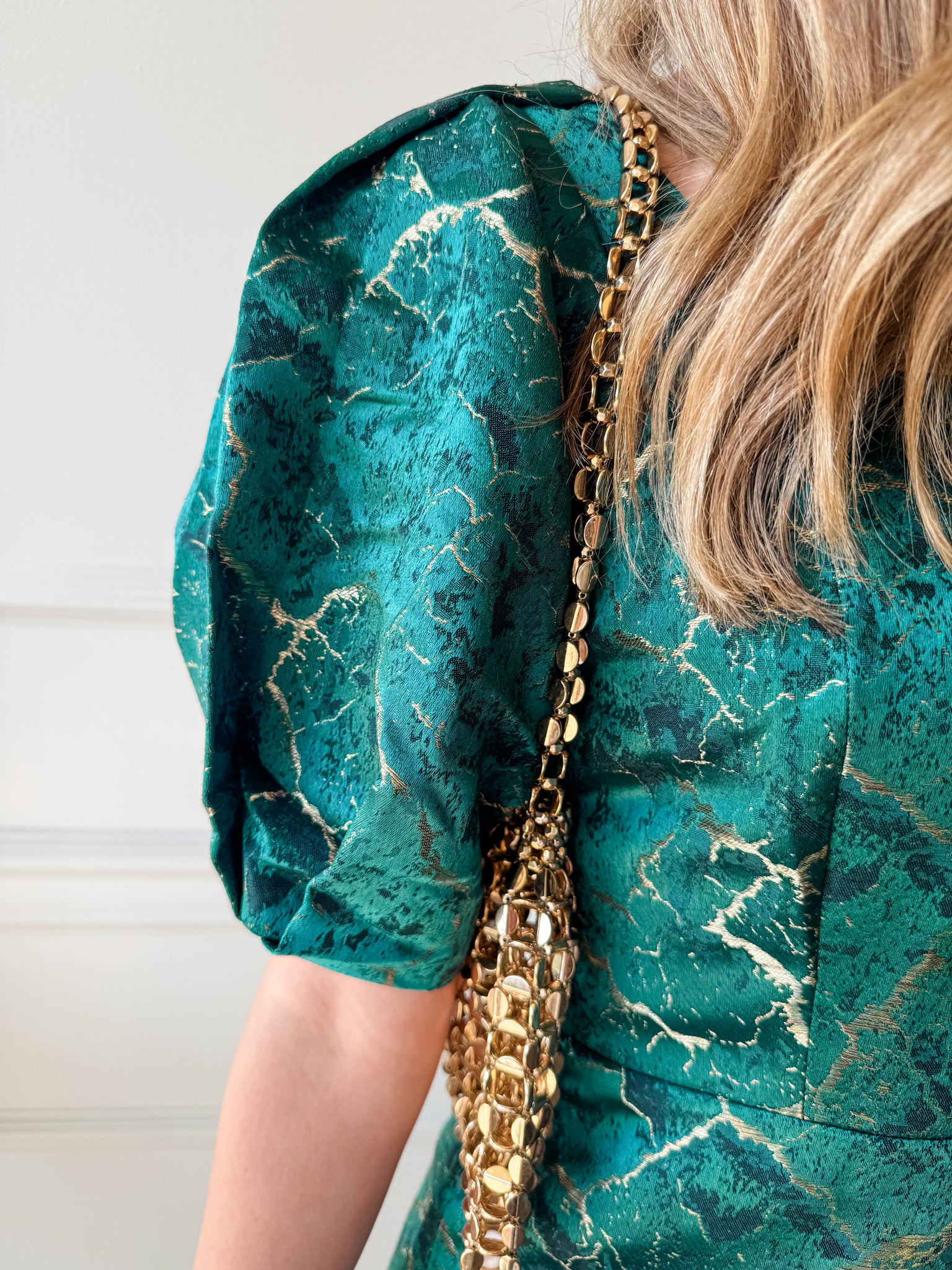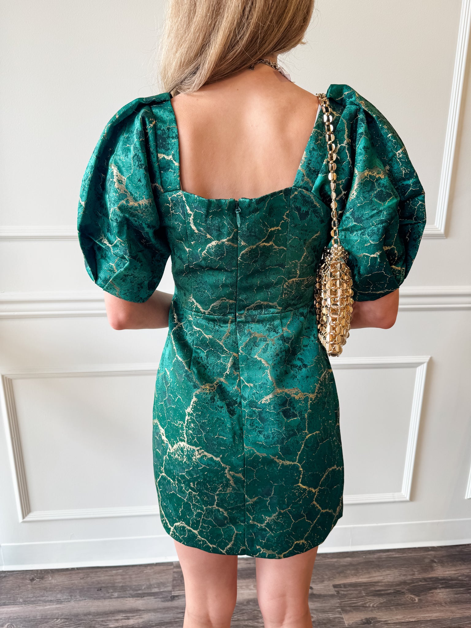 Crafted in a rich emerald green fabric with gold burnout detailing, this dress exudes luxury and texture.The structured puff sleeves add volume and drama, while the flattering square neckline and tailored silhouette create a feminine and confident look