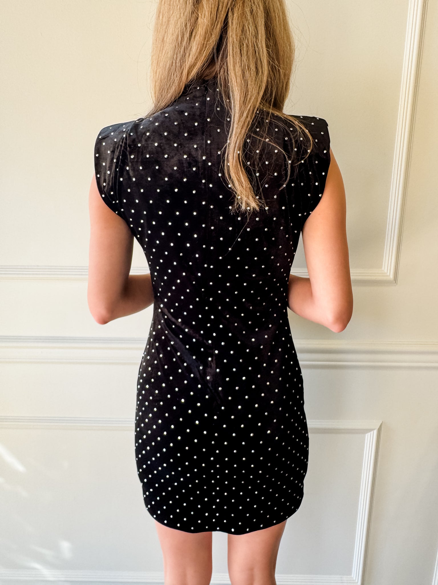 The ASTORIA DRESS BLACK is a sleek, sleeveless mini bodycon piece adorned with shimmering rhinestones, offering a captivating blend of sophistication and glamour. Its form-fitting design accentuates the silhouette, perfect for evening events or special occasions where elegance meets bold style. The subtle sparkle elevates your look effortlessly, ensuring you stand out with confidence.