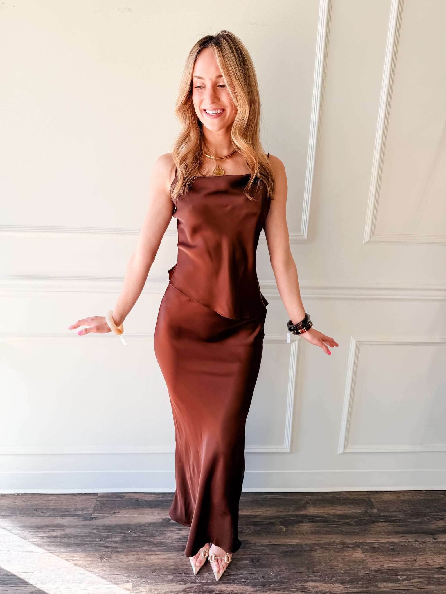 brown satin cami, chocolate satin top, silky camisole, date night top, holiday dinner top, boutique satin top, neutral dressy top