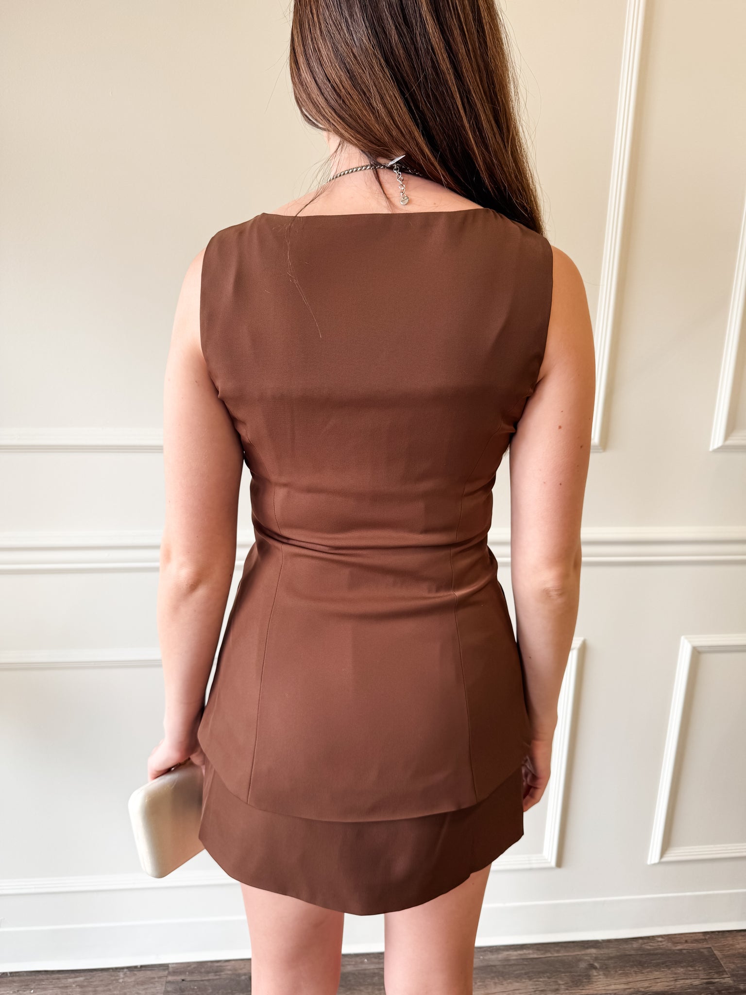 A structured brown vest-style mini dress with gold button details. Tailored, flattering, and perfect for layering or wearing solo for a polished statement look.