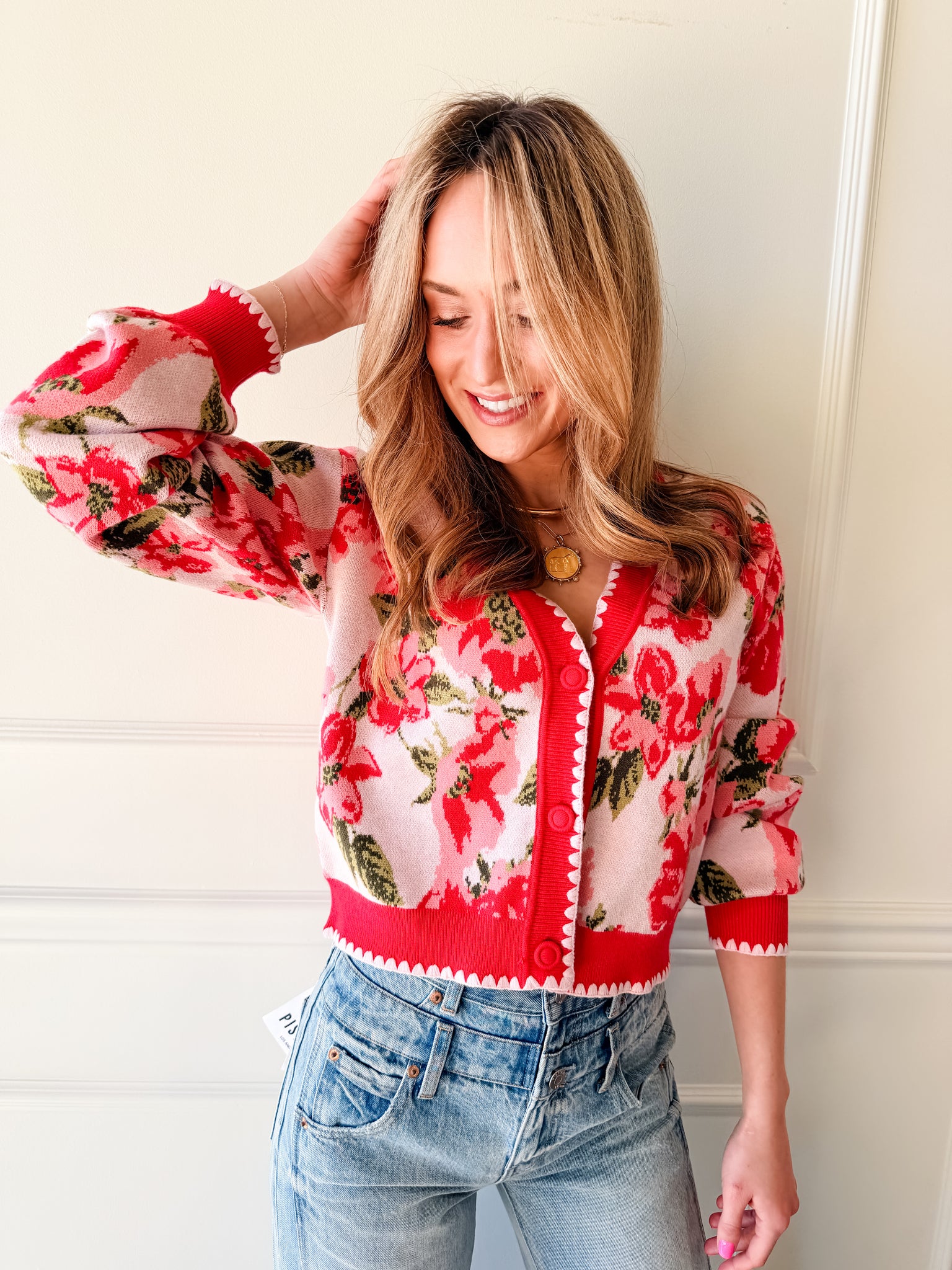 A Simply Chic exclusive-vibe favorite. The Rosé Garden Cardigan features a soft knit base, romantic rose print, bold red trim, and delicate scalloped edging for a vintage-inspired, ultra-feminine look. Wear it buttoned as a top or layered over a cami — it’s cute every way.